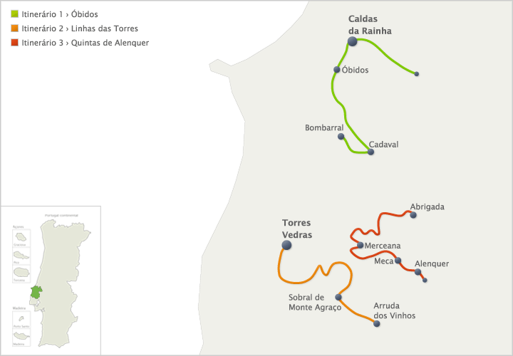 A região do Oeste situa-se entre o Oceano Atlântico e a Serra do Montejunto. A paisagem é marcada pela dicotomia serra/mar e pelos campos cultivados com vinha e árvores de fruto, uma vez que o Oeste é uma das maiores regiões produtoras de fruta de Portugal. A região do Oeste foi palco de inúmeras batalhas que decorreram durante as Invasões Napoleónicas e a marca mais visível dessa época são as “Linhas de Torres”, um conjunto de fortificações militares para impedir o avanço dos franceses sobre Lisboa. No norte da região, situa-se a vila medieval de Óbidos que não dispensa uma visita a pé pelas suas ruas sinuosas e enfeitadas por flores. Bem perto está a cidade de Caldas da Rainha, onde poderá relaxar nas termas fundadas no século XV ou visitar os diversos museus da cidade.