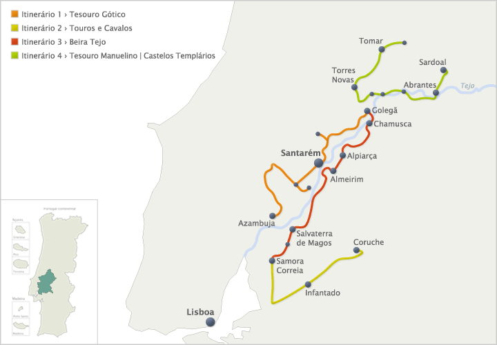 O rio Tejo e as lezírias são uma presença constante nos percursos da Rota do Vinho do Ribatejo. As terras são preenchidas com o cultivo de legumes, fruta e vinha e pela criação de touros e cavalos. As feiras e festas relacionadas com a agricultura vinha e coudelaria demonstram que a cultura ribatejana está intimamente ligada às actividades “da terra”. A cidade gótica de Santarém e o fantástico Convento de Cristo na cidade de Tomar são alguns dos monumentos mais belos da região. A serra também condiciona a paisagem da região: as Serras de Aire e Candeeiros impõem uma paisagem dominada pela pedra e que convida a caminhadas. Na zona ribeirinha passeie num barco varino pelo Tejo, aproveitando para observar a reserva natural do estuário do Tejo.